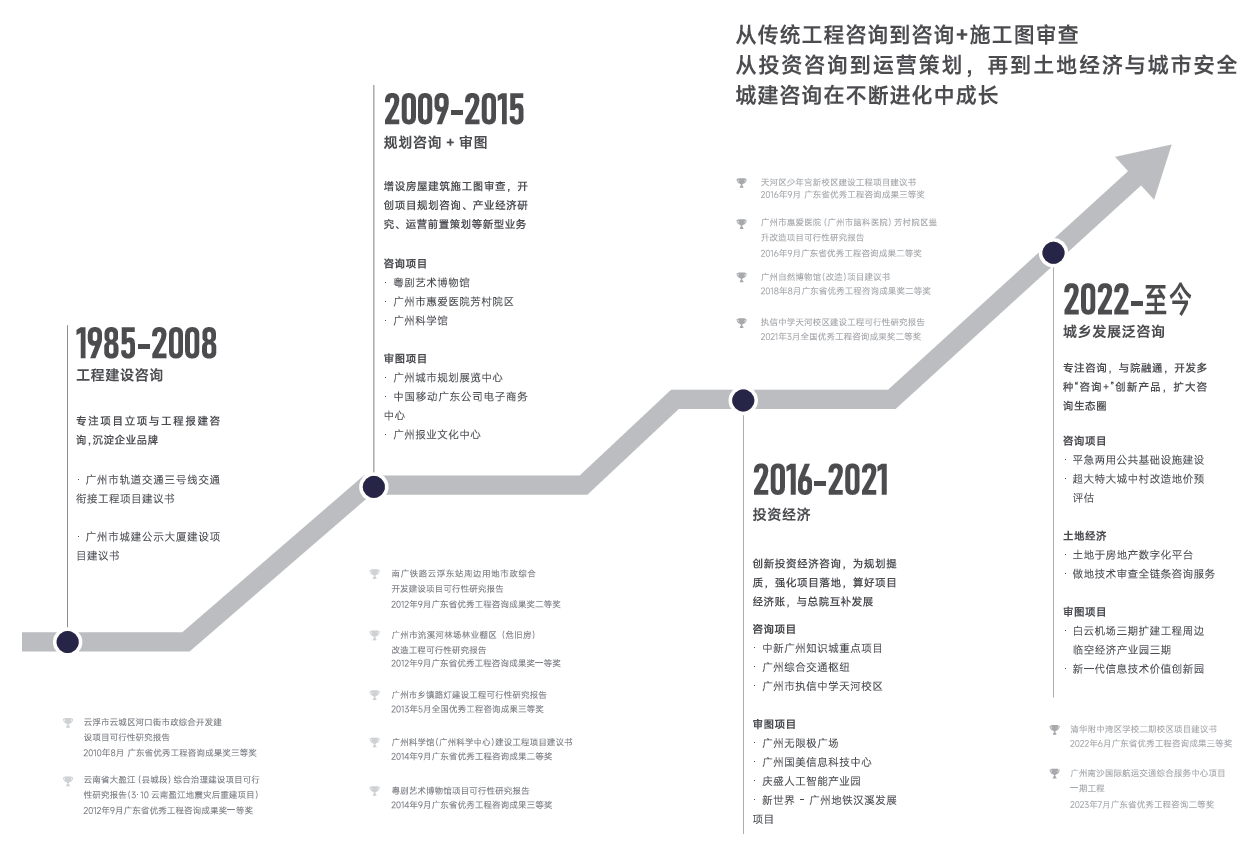2008 年,是公司发展历程中极具里程碑意义的一年。这一年,公司成功获得施工图审查资质,进一步拓宽了业务边界。与此同时,在规划咨询业务的基础上,工程咨询版块应运而生。自此,规划咨询、工程咨询、施工图审查三大核心业务版块正式形成,构建起公司多元发展的业务格局。